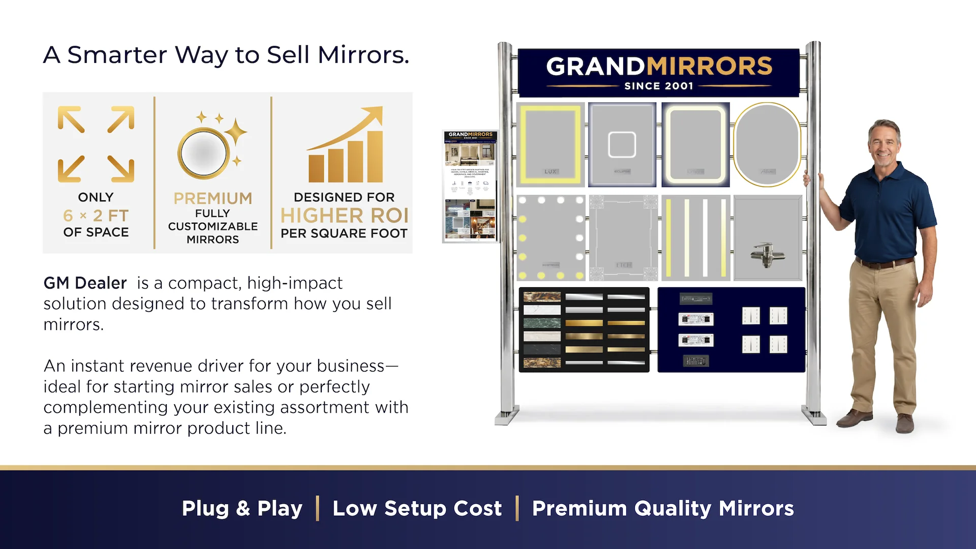 Grand Mirrors is expanding its authorized reseller network through the GM Dealer program — a compact, high-impact in-store solution for retailers to sell premium, custom-made Grand Mirrors bathroom mirrors.